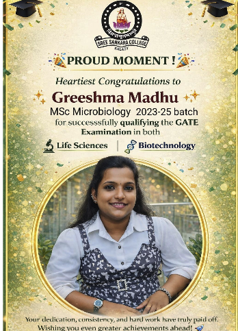 Greeshma Madhu (2023-25 batch) Qualified GATE 2025 both in Life Sciences and Biotechnology