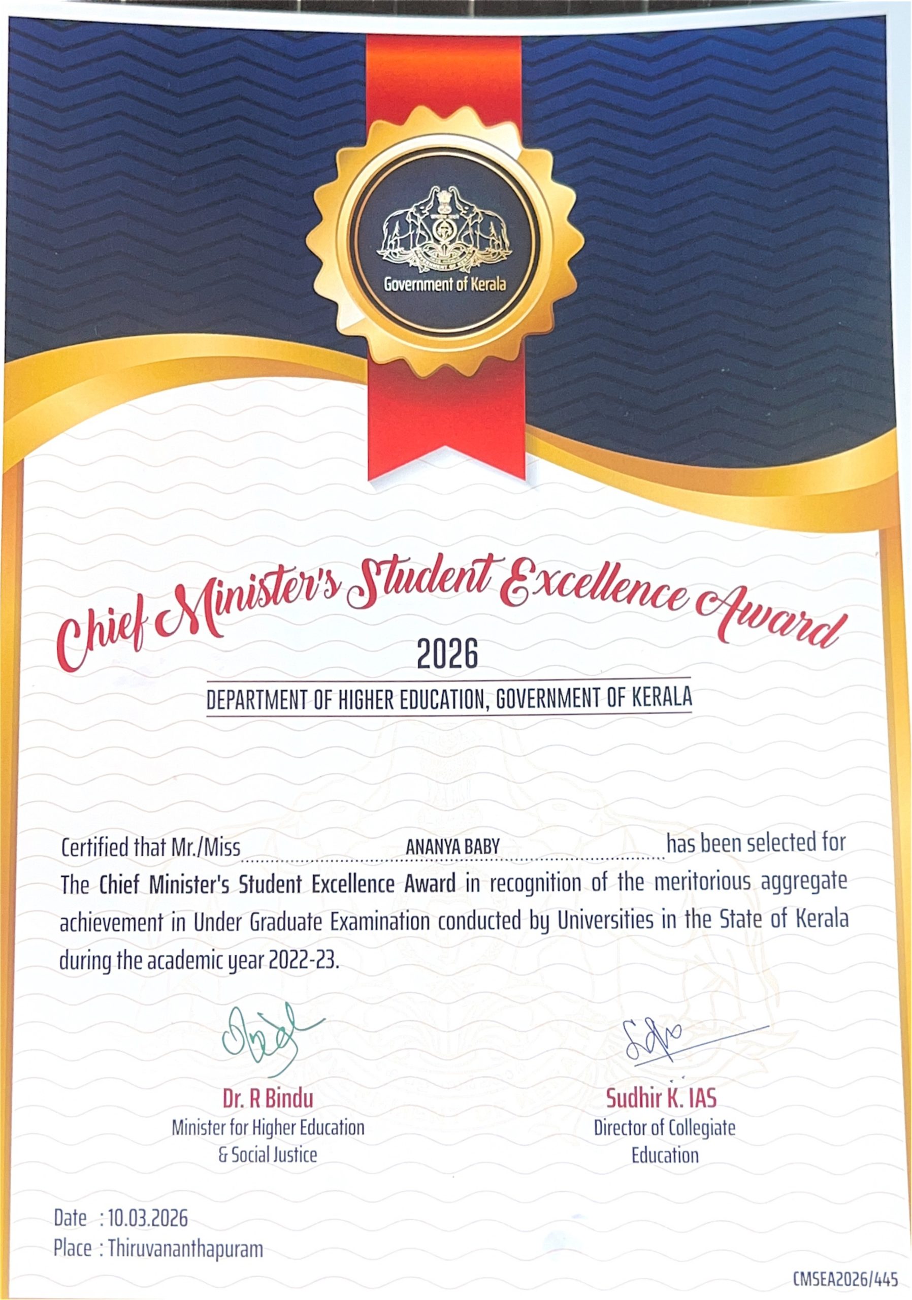 Ananya Baby of the 2020-2023 Batch received the Chief Minister's Student Excellence Award 2026 in recognition of the meritorious aggregate achievement in Under Graduate Examination conducted by Universities in the State of Kerala during the academic year 2020-23.