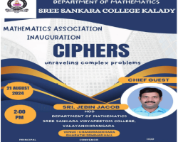 The Department of Mathematics, Sree Sankara College, Kalady, successfully inaugurated its Mathematics Association, “Ciphers – Unravelling Complex Problems”, on 21st August 2024 at 2 PM in the Chandrasekhara Bharathi Seminar Hall. The event was graced by the presence of Sri Jebin Jacob, Head of the Department of Mathematics, Sree Sankara Vidyapeetom College, Valayanchirangara, as the chief guest.