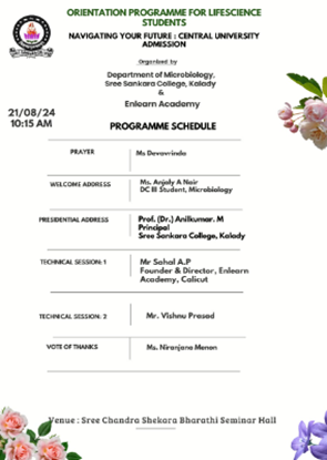 The Department of Microbiology, Sree Sankara College, Kalady, in association with Enlearn Academy organized an orientation programme titled “Navigating Your Future: Central University Admission” on 21st August 2024.. The event was specifically aim to provide guidance and direction to life science students interested in pursuing higher education at central universities.