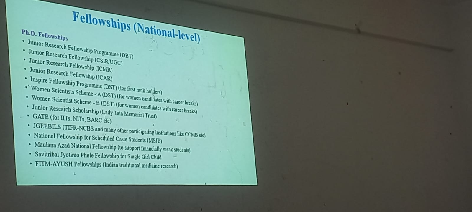 The session emphasized the eligibility criteria, application procedures, and preparation strategies required to secure these fellowships. Students were also introduced to the importance of competitive exams, research aptitude, and academic excellence in building a successful career in biotechnology. The speaker encouraged students to actively explore research opportunities and stay updated with emerging trends in the field.