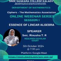 The inaugural session of the online webinar series, hosted by the Ciphers Mathematics Association with support from the IQAC Smart Scheme, was held on October 5, 2024. The chosen topic, “Essence of Linear Algebra,” aimed to provide attendees with foundational insights into linear algebra and its real-world applications.